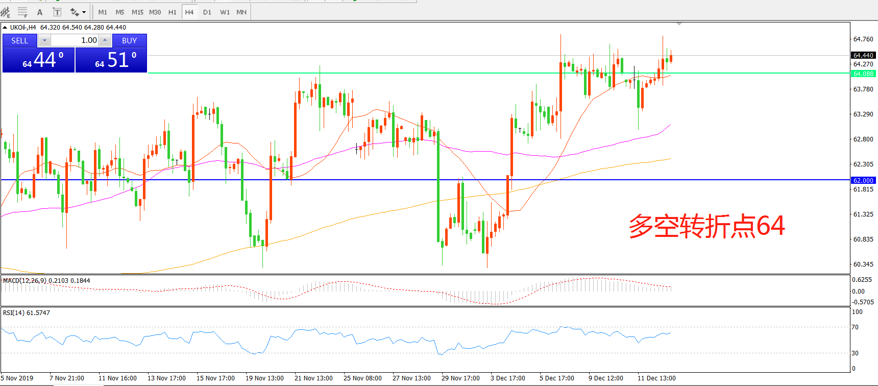 4小时图看,油价延续高位震荡,64美元依然是多空分水岭,均线系统呈多头排列,MACD红柱减少,RSI指标走平,日内延续震荡概率较大。