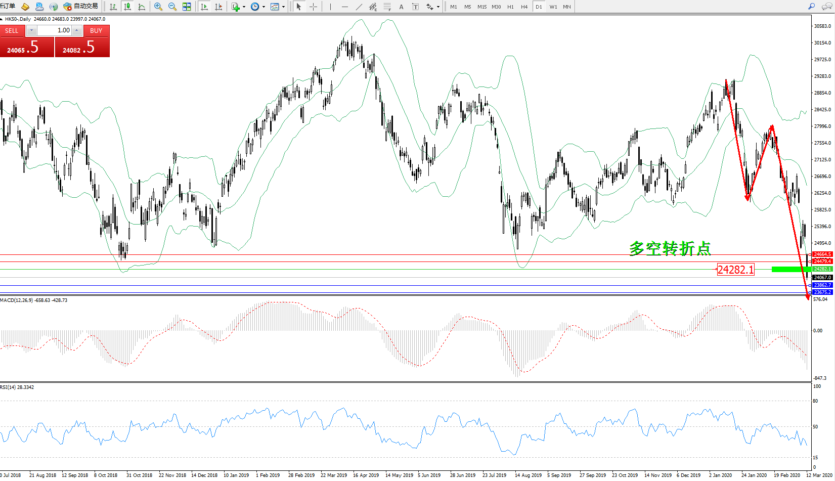 香港恒生指数3月12日(周四)收盘下跌922.54点,跌幅3.66%,报24309.07点;全球股市暴跌,市场一片哀嚎,港股恒指跟随多国股市进入技术性熊市。港A两地市场亦受重挫,港股主要股指皆大跌。恒指国指上午盘一度跌超4%,腾讯、中国平安等重磅蓝筹集体大跌。料市场持续受海外疫情与石油战消息影响,短期超跌可望迎来一波技术性反弹,但仍应保持谨慎投资。主板成交量为1522.62亿港元,港股通大幅净流入129.84亿港元。恒指波幅指数涨超30%,报47.92,刷新历史高位;反映投资者对30个交易日内恒指大幅向下波动的预期显著增强。隔夜12日晚间(北京时间)美股大幅低开,随后跌幅不断扩大,标普500指数跌幅扩大至7%,触发熔断,美股暂停交易15分钟。该次熔断,为美股史上第三次触发熔断。
