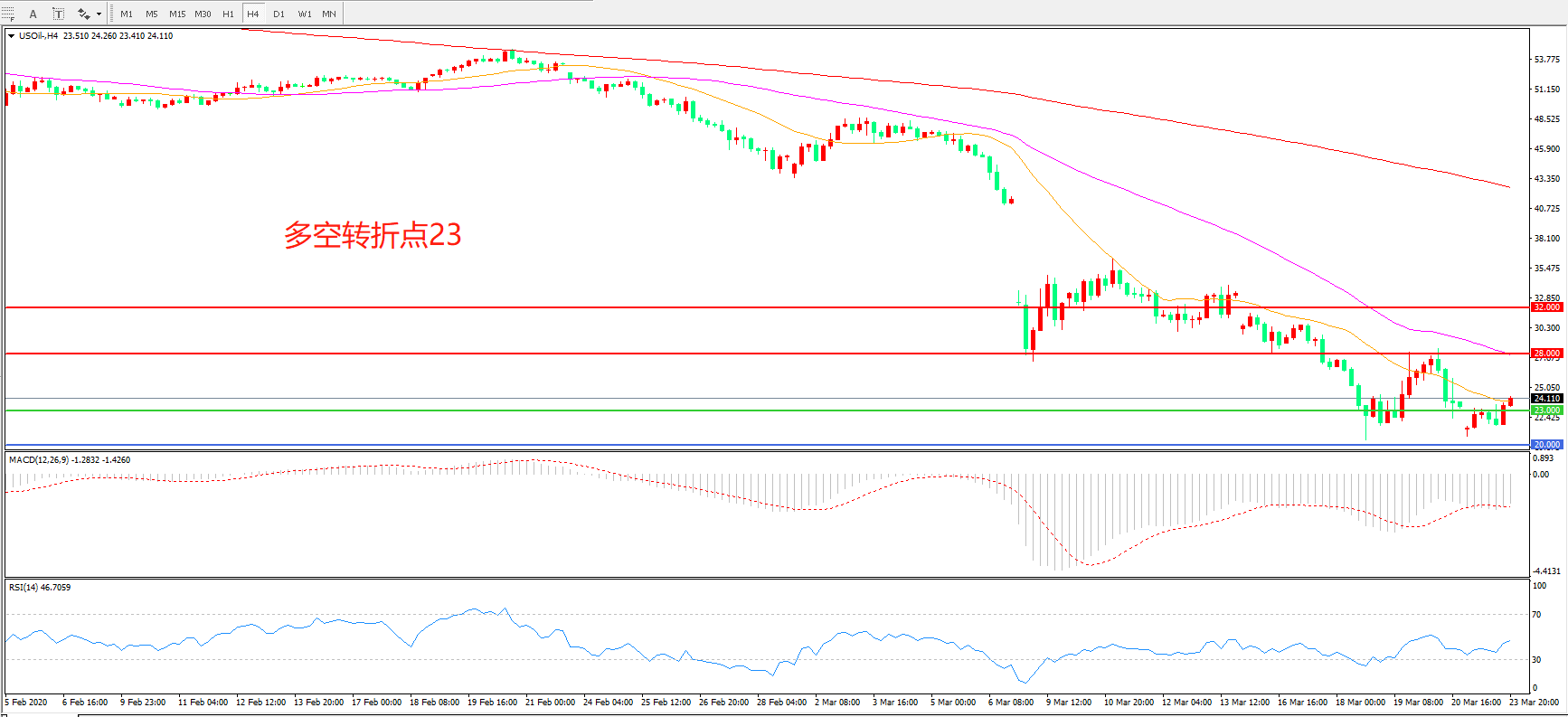 周一(3月23日),美国国会参议院未能就一项纾困计划达成一致使得原油和其他高风险资产继续承压,但随后,美联储再度召开紧急会议,放出“王炸”,宣布购买无限量的政府债券和投资级公司债券,这是美联储迄今为止最激进的市场干预行动。在乐观情绪的推动下,WTI原油出现探底回升,收报24.19美元/桶。