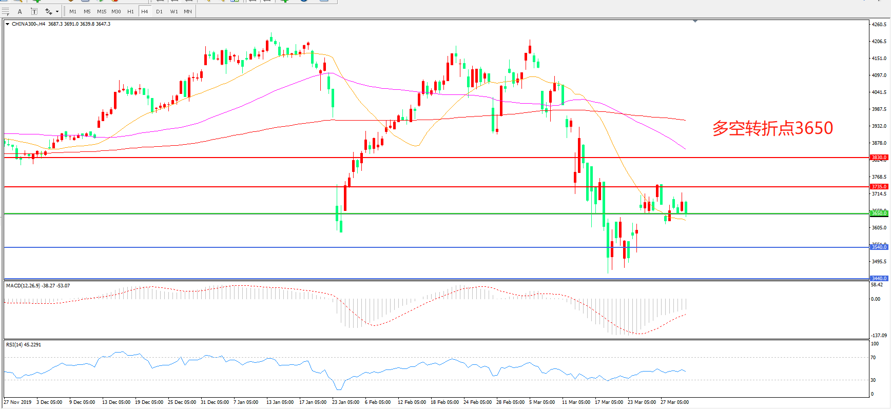 4小时图看,沪深300先涨后跌,整体维持宽幅震荡形态,均线系统逐渐走平,MACD绿柱缩短,RSI指标走平,日内维持震荡概率较大。