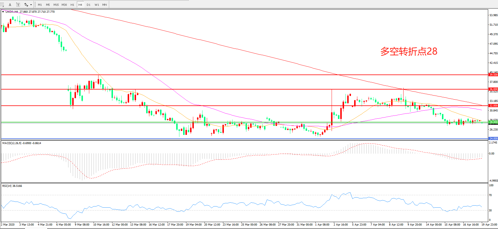 4小时图看,油价整体波幅不大,低位震荡迹象较为明显,28美元成为短期支撑,32美元成为上方阻力, MACD绿柱缩短,RSI指标走平,日内延续震荡概率较大。