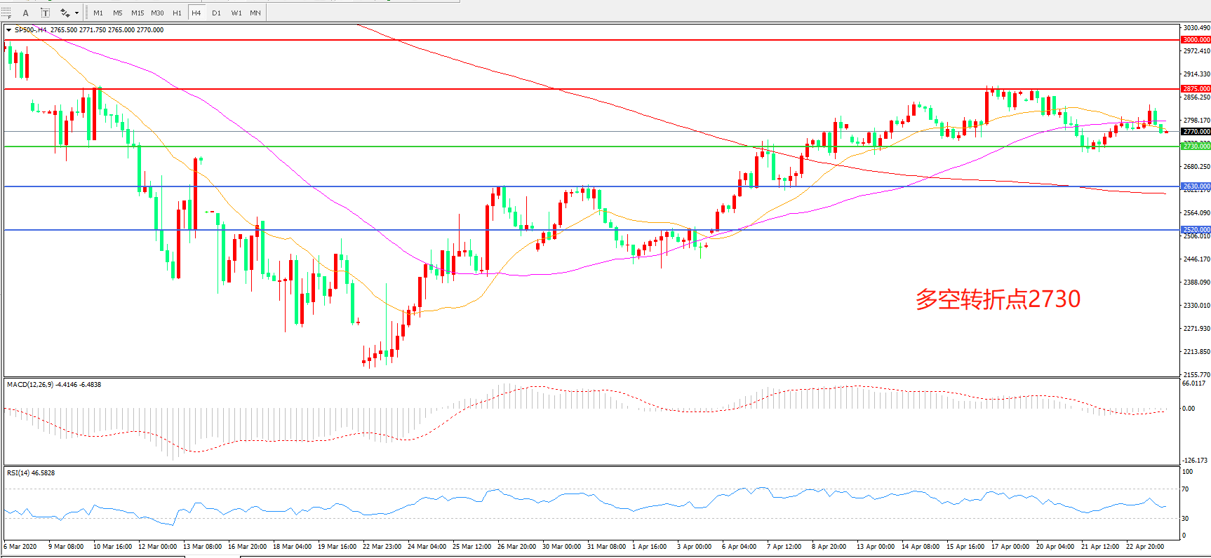 4小时图看,标普延续高位震荡, 2730成为短期多空分水岭,均线系统粘合成为短期阻力,MACD红柱增加,RSI指标走平,日内震荡上行概率较大。