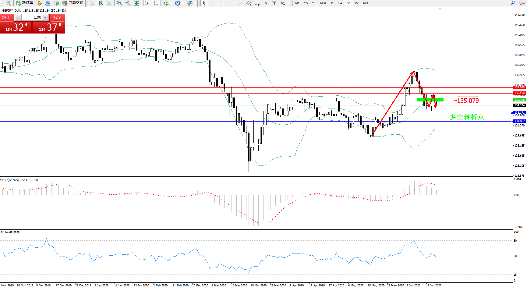 交易策略:135.079下方看跌,目标133.171131.867
