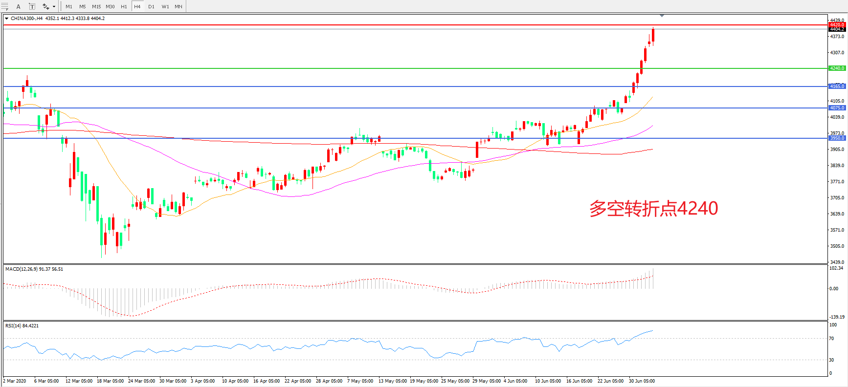 4小时图看,沪深300长阳连续拉升,多头趋势明显,均线系统呈多头排列, MACD红柱增加,RSI指标向上,日内延续上行概率较大。