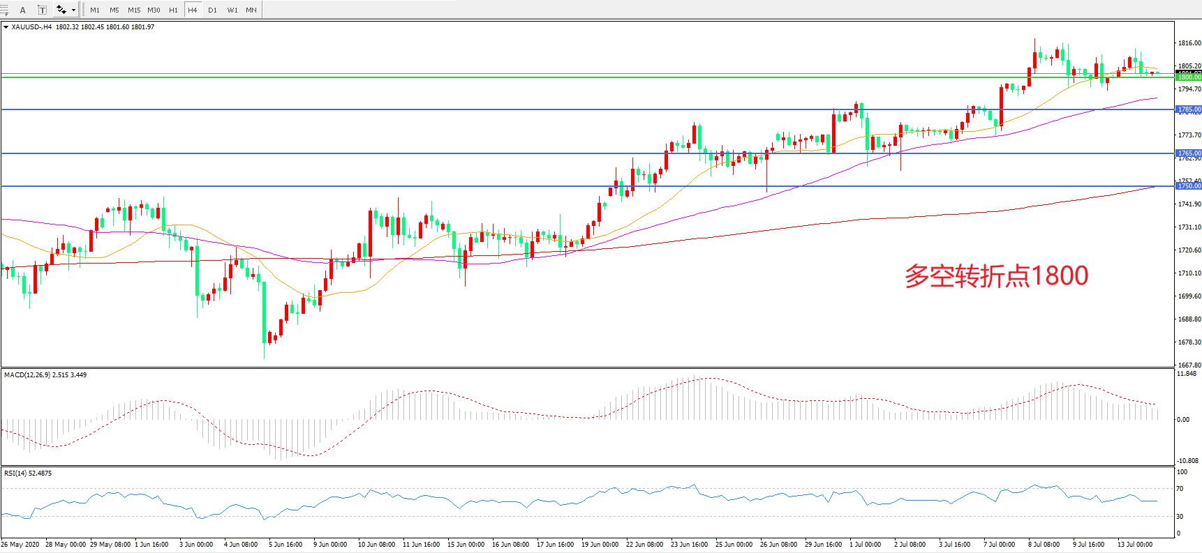 交易策略:在1800.00之上看涨,目标1820.00   1845.00