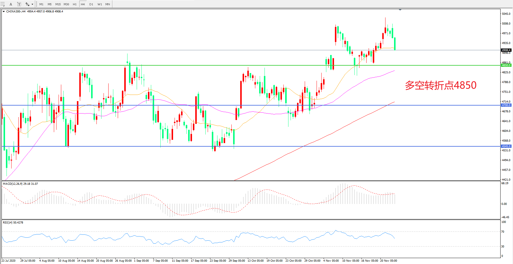 4小时图看,沪深300长阴连续下破,上行趋势遭到破坏,21周期均线成为短期支撑,5000成为短期阻力,MACD红柱缩短,RSI指标向下,日内延续震荡概率较大。