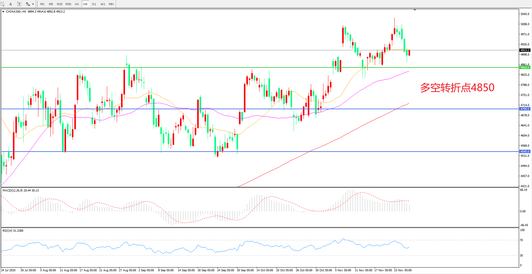 4小时图看,沪深300长阴下破后小幅回升,短期走势有所回暖,4850成为短期支撑,5000成为中期阻力,MACD红柱缩短,RSI指标走平,日内延续震荡概率较大。
