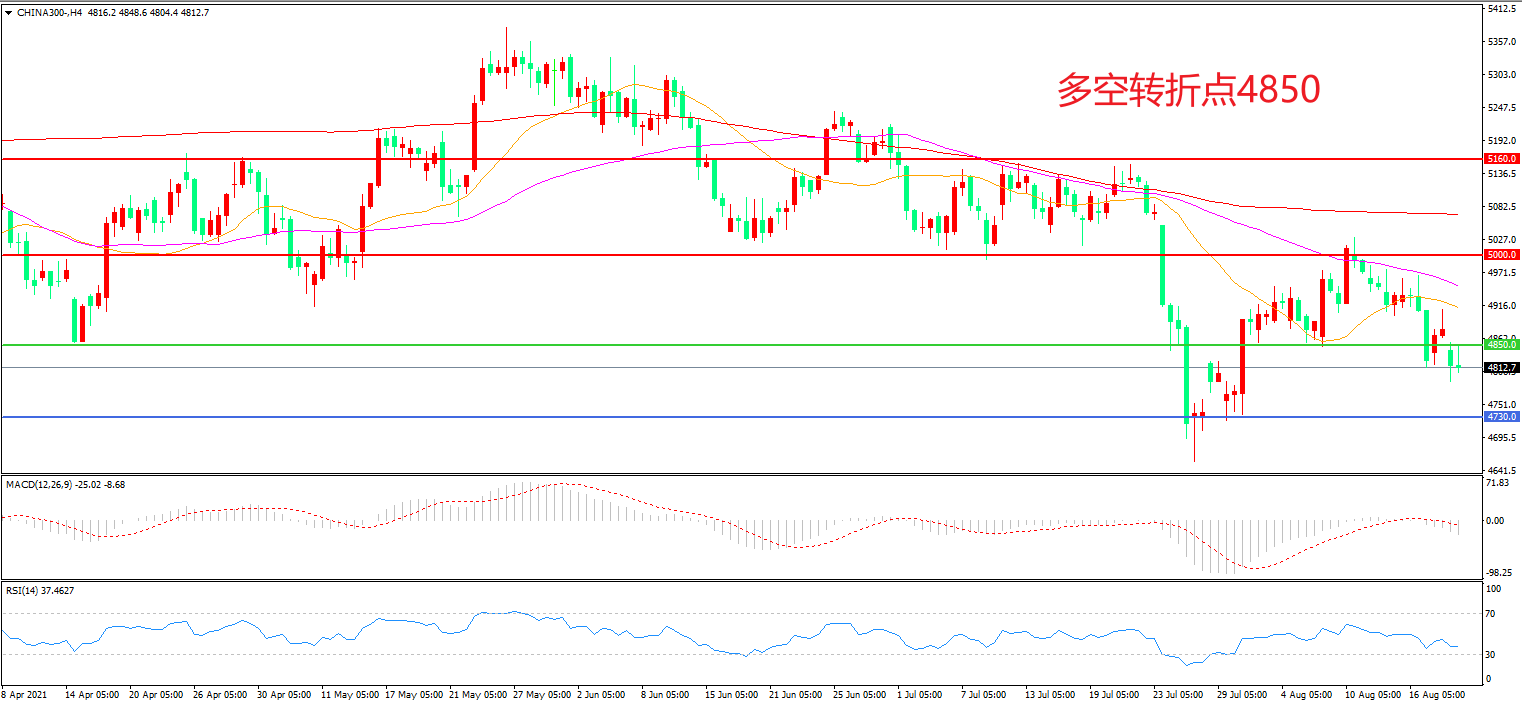 4小时图看,沪深300受制于均线系统阻力,下行趋势较为明显,4850成为短期多空分水岭,MACD绿柱增加,RSI指标走平,日内震荡下行概率较大。