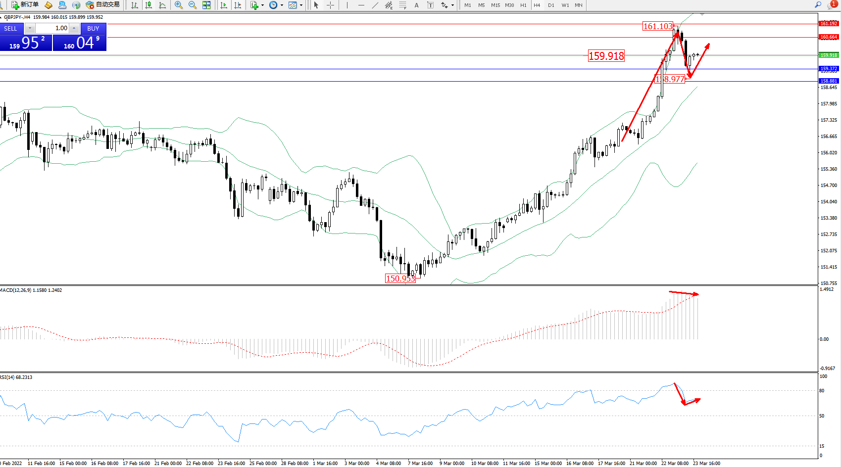 技术点评:多头动力延续布林带指标上轨附近持续震荡上扬,高位抵达161.103附近节点后遇阻回撤,短期多头动力有继续攀升态势,布林带指标呈张口走势后开始收口不断上移,MACD指标处于多头区域维持高位弱势整理,RSI指标处于多头区域高位回撤后开始徘徊;