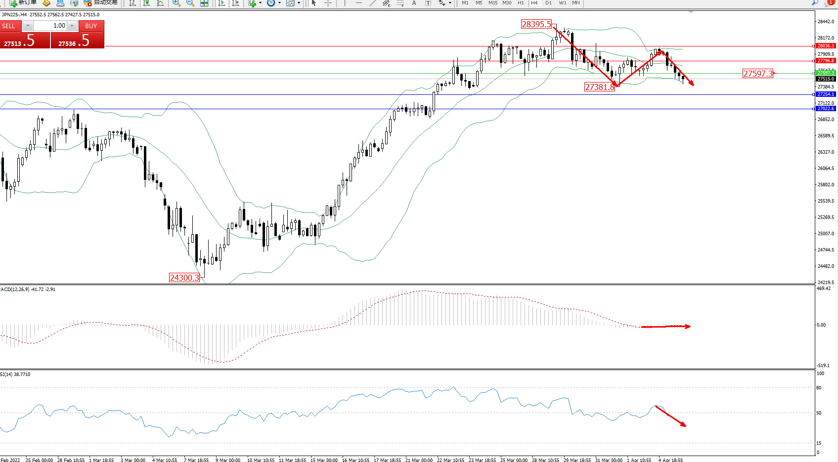 技术点评:空头动力延续布林带指标通道内维持窄幅整理持续,期间多次来回触及上下轨区间节点,低位再度下挫,市场空头动力入场,前底27381位置近在咫尺破位在即,布林带指标呈缓慢张口走势中,MACD指标处于0轴线附近徘徊,RSI指标处于50均衡线下侧维持震荡下行;