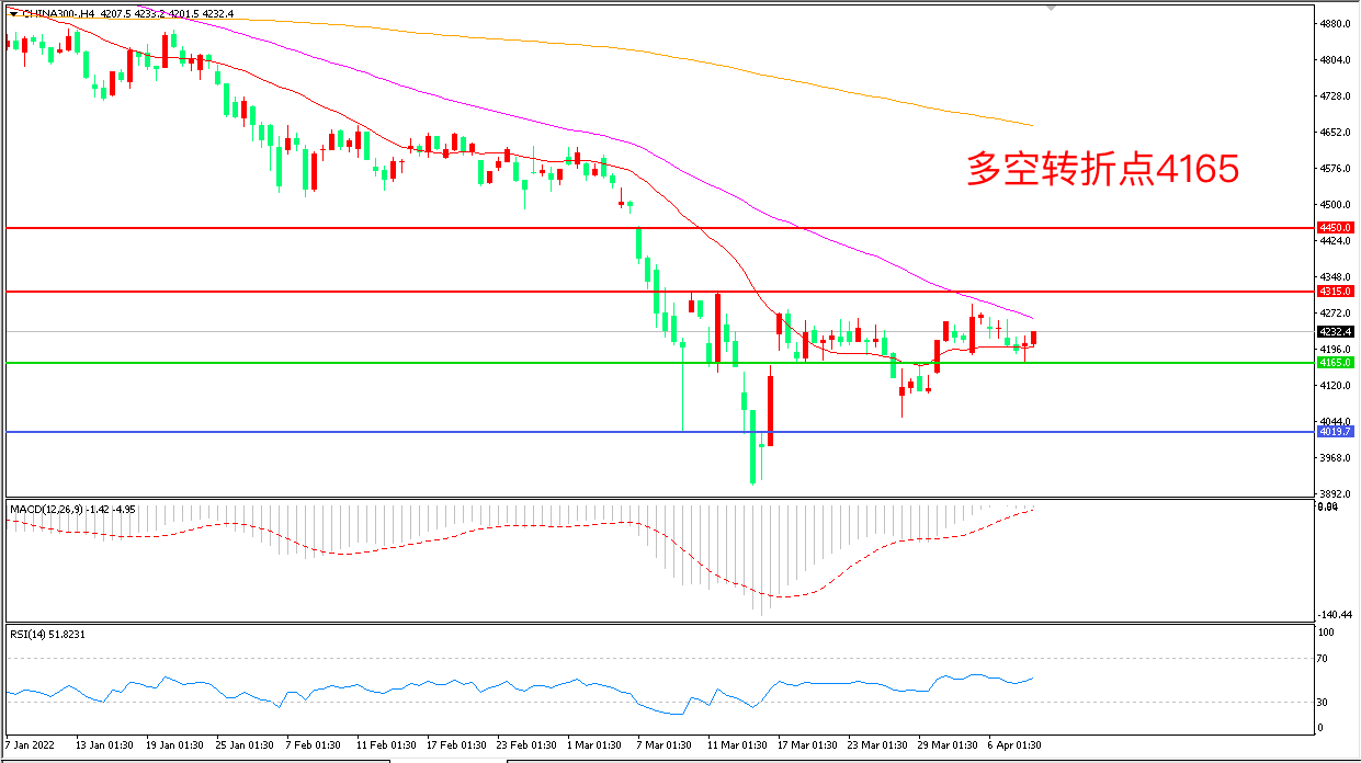4小时图看,沪深300以4165为依托展开整理,整体波幅不大,55周期均线成为阻力, MACD绿柱缩短,RSI指标走平,日内延续震荡概率较大。