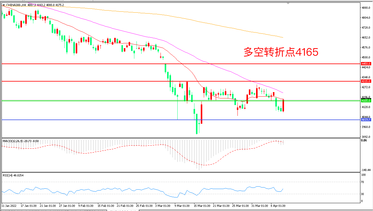 4小时图看,沪深300连续下跌后大幅拉升,短期看有止跌迹象,但均线系统呈空头排列, MACD绿柱增加,RSI指标走平,日内震荡下行概率较大。