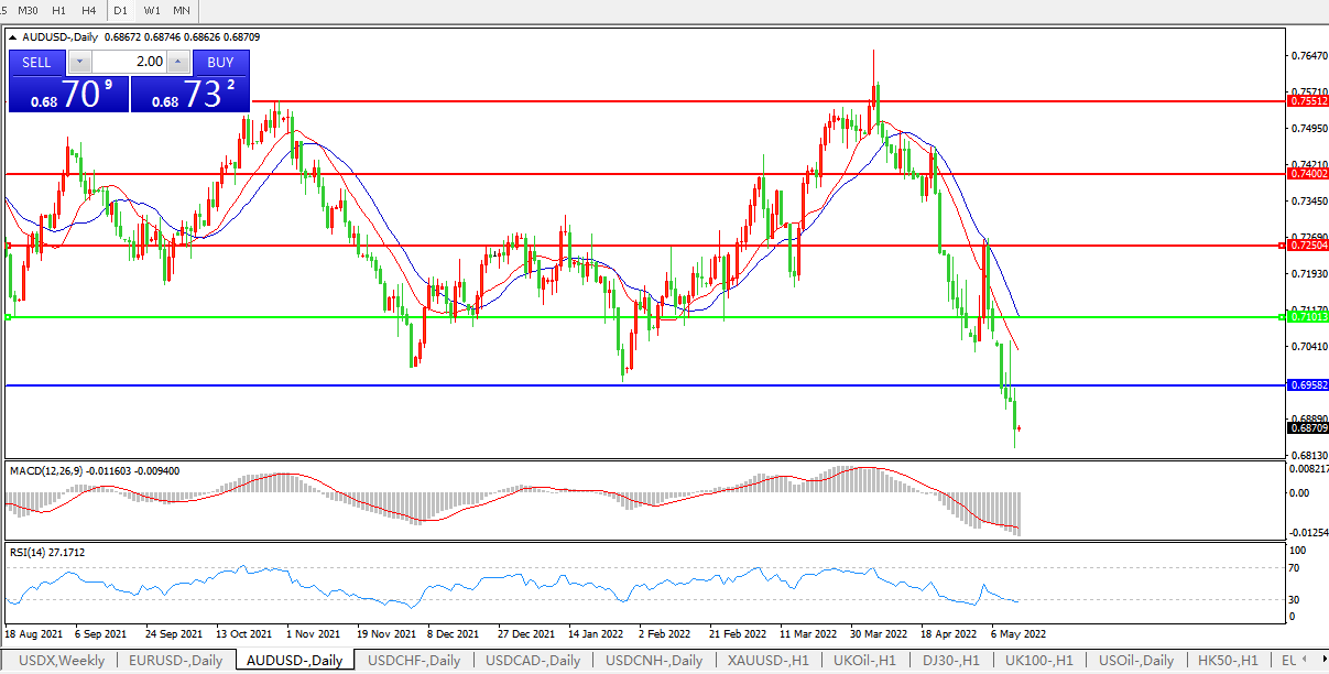 技术面简析:日图均线呈空头排列,汇价反弹后再度下行,MACD运行于0轴下且量能小幅放量,RSI再度下行,预计汇价大概率将进一步下行。
