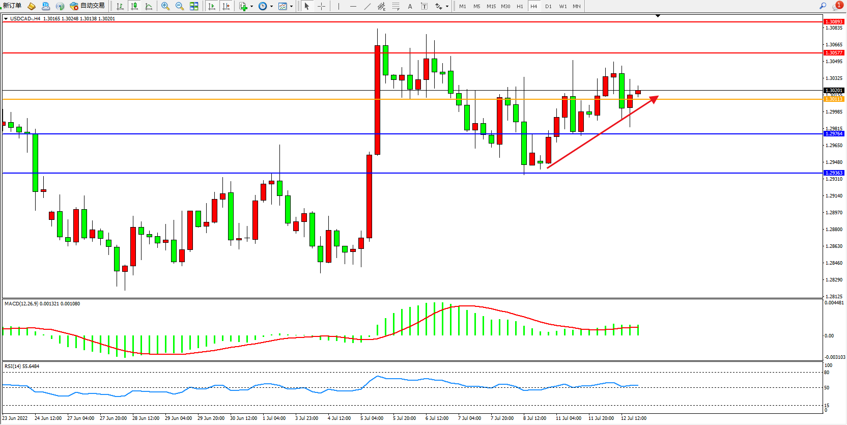 4小时图看:多头动力维持震荡短期向上移动,前期高位近在咫尺,有继续拉升走势迹象,MACD指标处于多头区域维持整理平移,RSI指标处于50均衡线上側徘徊中;