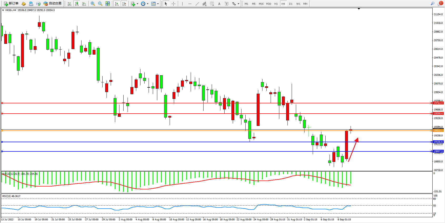周一香港交易所中秋节,休市一日,香港恒生指数9月9日(周五)收盘上涨507.63点,涨幅2.69%,报19362.25点;连续下跌的港股终见反弹,三大指数全天单边呈上涨行情,恒指涨2.69%,上扬超500点重回19000点上方,国指、恒生科技指数分别涨2.98%和2.6%,三者均止步连跌行情。大金融股、蓝筹地产股等权重皆拉升助力大市反弹;南下资金逆势净流入12.04亿港元,大市成交额为922亿港元。