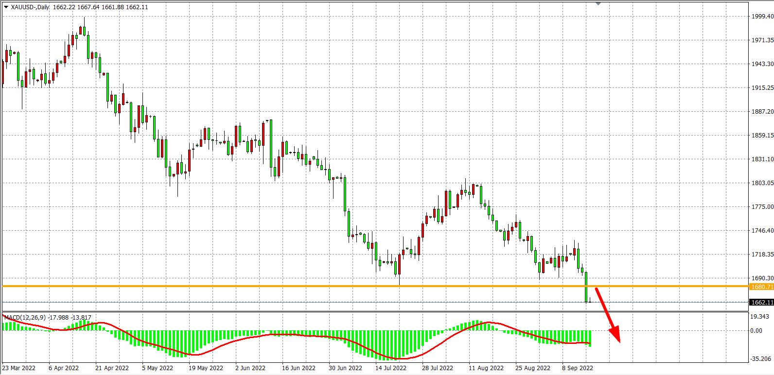 日线图看,金价连续三个交易日收跌,昨日再度强势下破中期强支撑1680美元一线,MACD于零轴之下呈现持续放量,显示趋势延续跌势,1680美元成为目前强支撑,日内在该位之下维持看跌,下方目标1645-1620