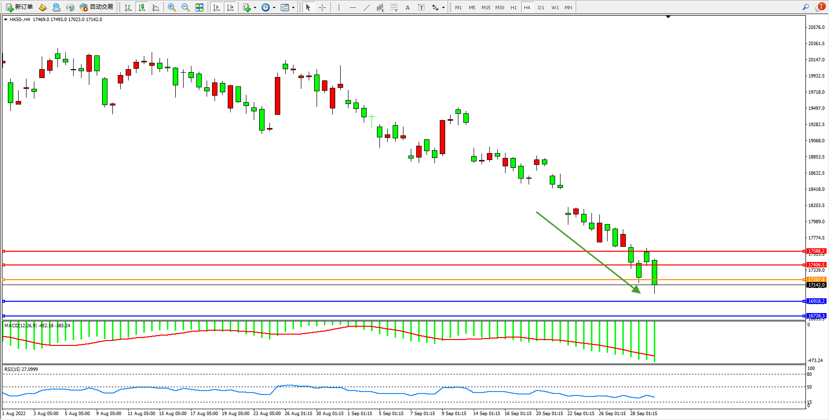 香港恒生指数9月29日(周四)收盘下跌85.01点,跌幅0.49%,报17165.87点;受隔夜美股反弹影响港股早盘高开,三大指数高开低走午后集体转跌。恒指跌0.49%,国指跌0.78%,恒生科技指数跌1.24%,皆刷新调整低价,权重科技股多数下挫,小米跌近5%,近期活跃的餐饮股、旅游及观光股下跌明显。