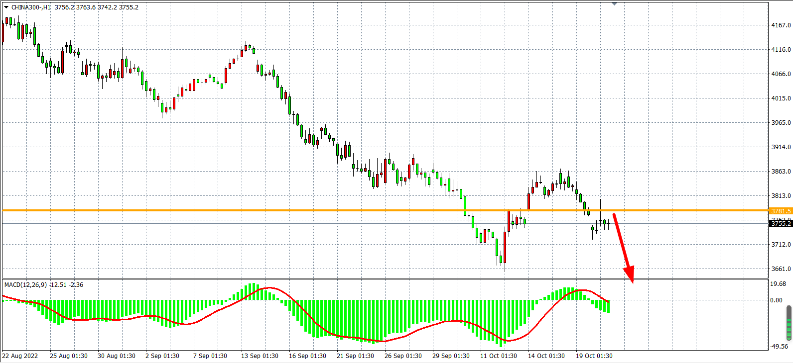 1小时图看,沪深300在3869附近出现受阻回落,且跌破3780一线的支撑,目前强支撑已转化为压力,MACD于零轴下开始重新放量,短期趋势偏弱,日内在3780之下看跌,下方看3700-3660。