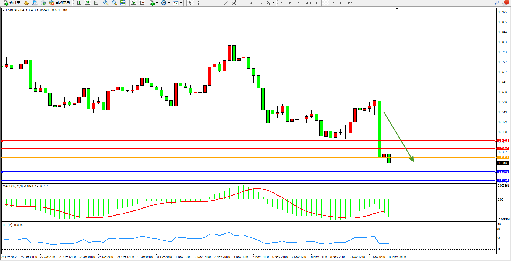 美元兑加元维持1.33118附近震荡,美国10月未季调CPI年率录得7.7%,为2022年1月以来最小增幅。可能促使美联储放慢加息脚步,这将被视为促进经济和石油需求增长的积极因素。