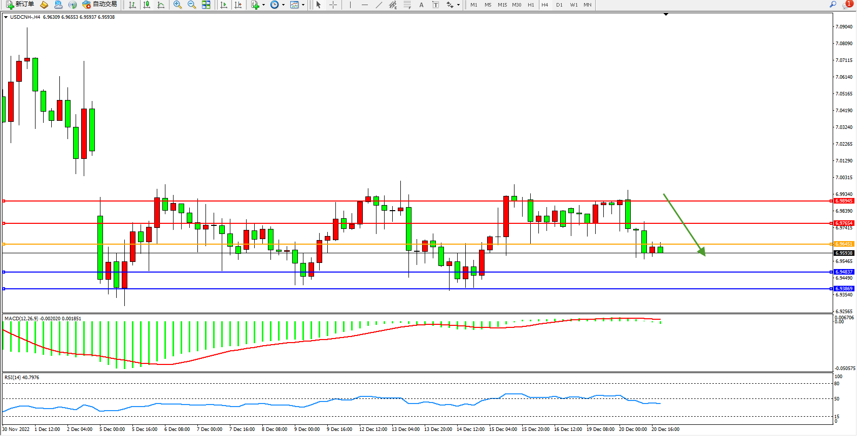 美元人民币USDCNH——4小时K线图显示: