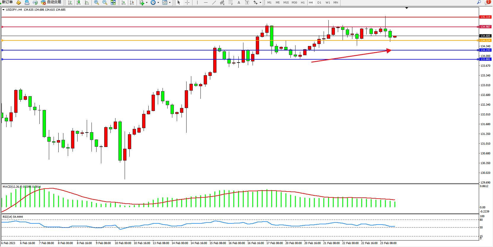 4小时图看:高位短期窄幅整理,市场多头动力整体处于偏弱势,但依旧处于高位徘徊中,MACD指标处于多头区域平缓走势,RSI指标处于50均衡线上側弱势徘徊;