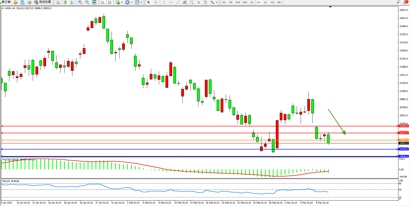 4小时图看:空头低位持续震荡下行,短期跌势或将延续,市场整体处于向下移动态势良好,MACD指标处于0轴线下侧徘徊,RSI指标处于50均衡线下侧整理;