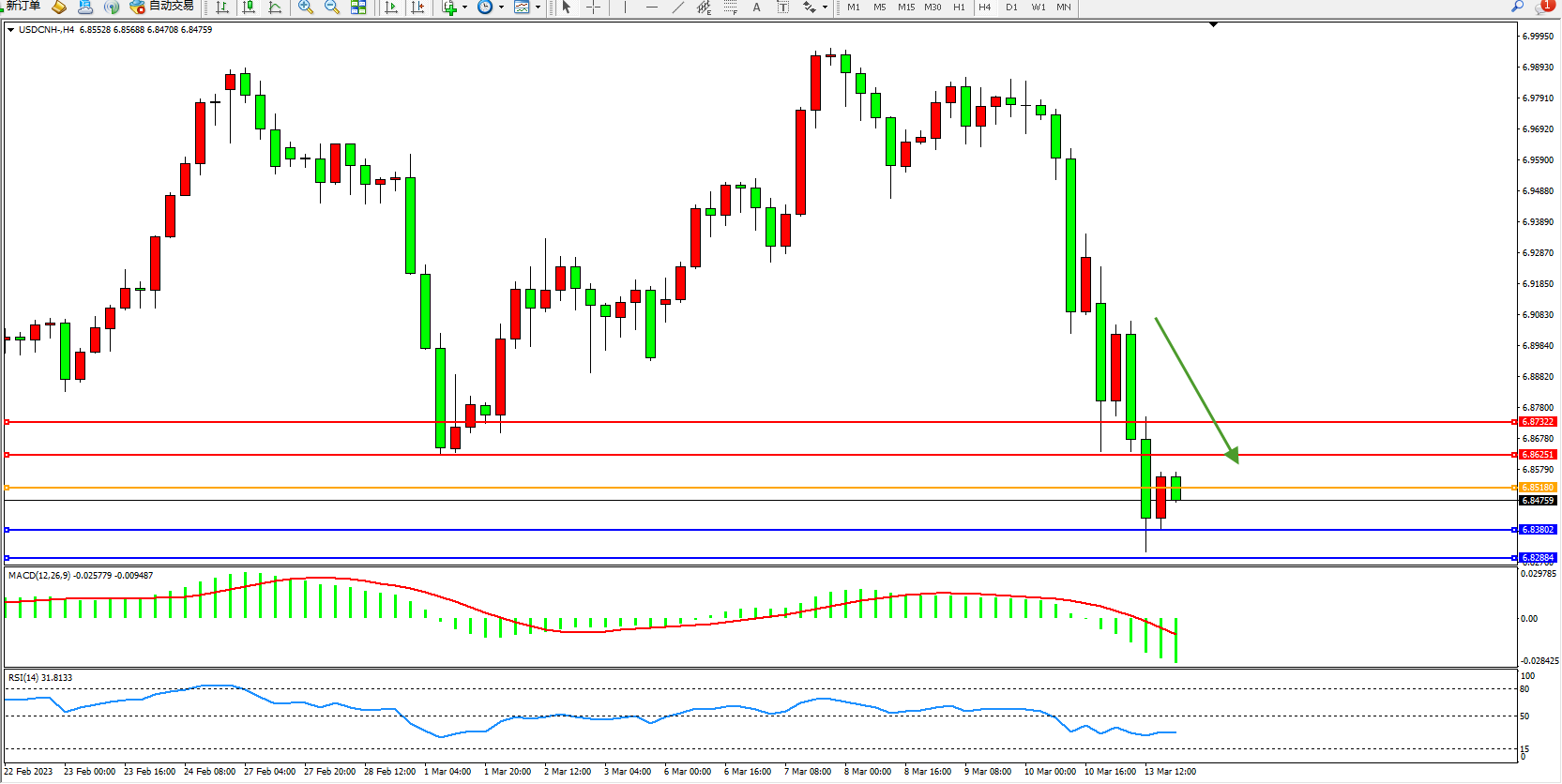 美元兑人民币维持6.84759附近震荡,硅谷银行事件影响趋弱,李强总理讲话提振了市场信心,人民币更是一度狂飙超500点,全球风险市场迎来大反弹行情。