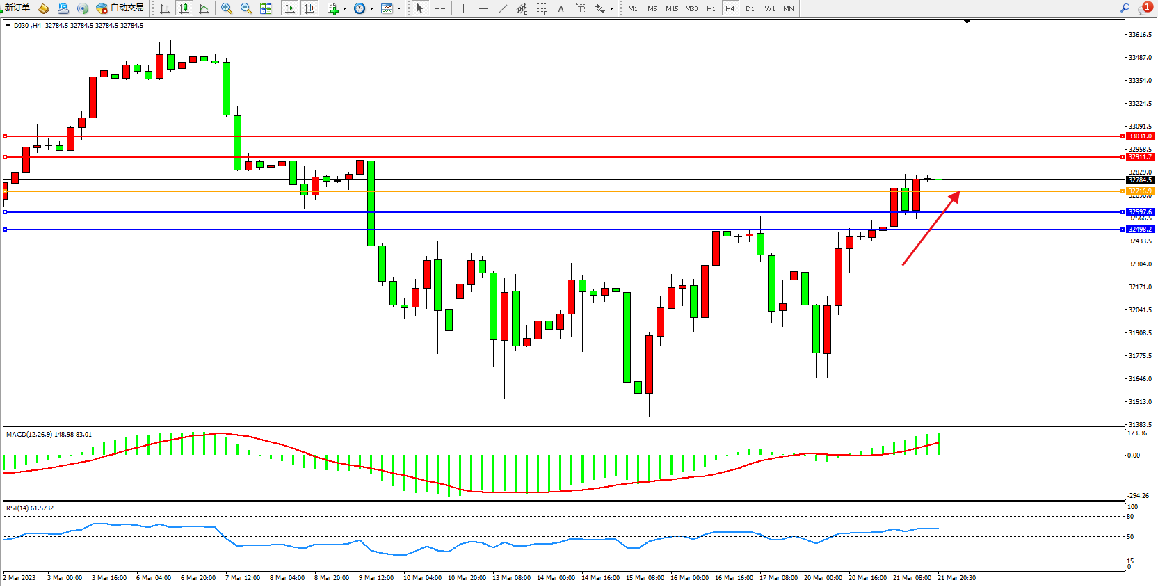 道琼斯指数3月21日(周二)收盘上涨317.24点,涨幅0.98%,报32561.82点;交易员现在加大了对美联储将暂停加息周期以试图确保金融稳定的押注,但总体上仍对美联储是否会继续提高基准政策利率存在分歧。