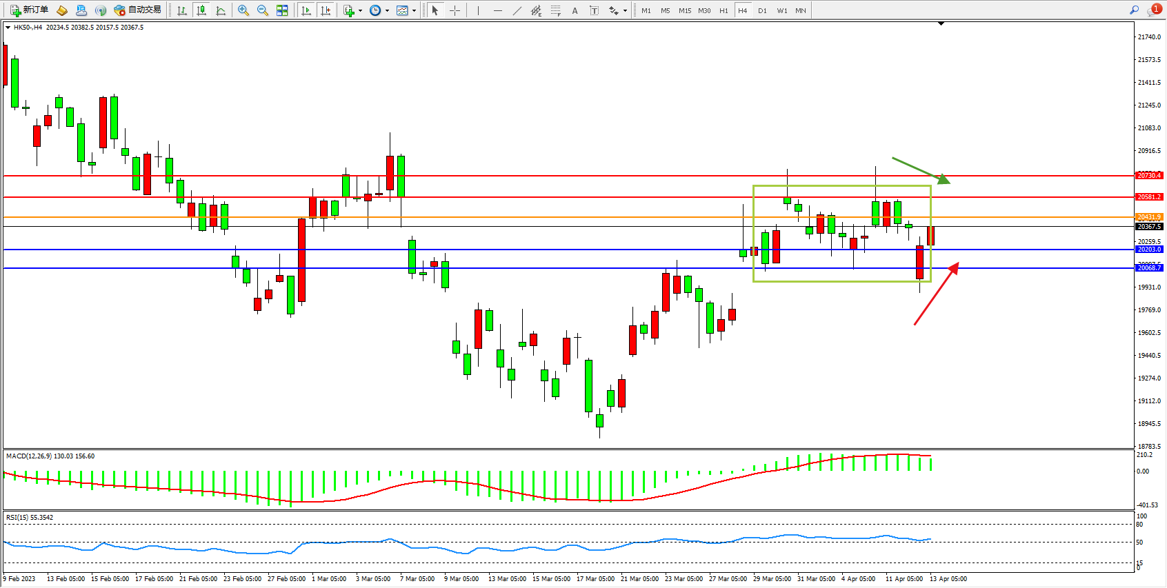 4小时图看:日内低开走高,但仍偏弱势,短期纠结高位宽幅区间震荡,短期多次来回刺探上下轨区间节点,MACD指标处于多头区域整理平移,RSI指标处于50均衡线上側弱势徘徊;