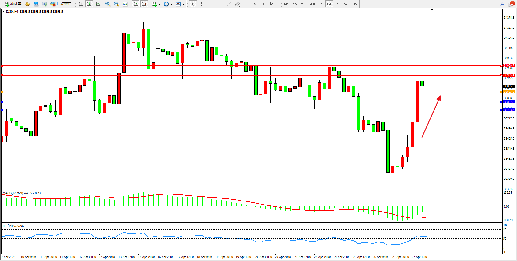道琼斯指数4月27日(周四)收盘上涨524.79点,涨幅1.58%,报33826.66点;美国商务部第一季度GDP折合成年率增长1.1%。国第一季度经济增长放缓幅度超过预期,原因是企业投资不温不火,库存回落抑制了消费者支出的回升。