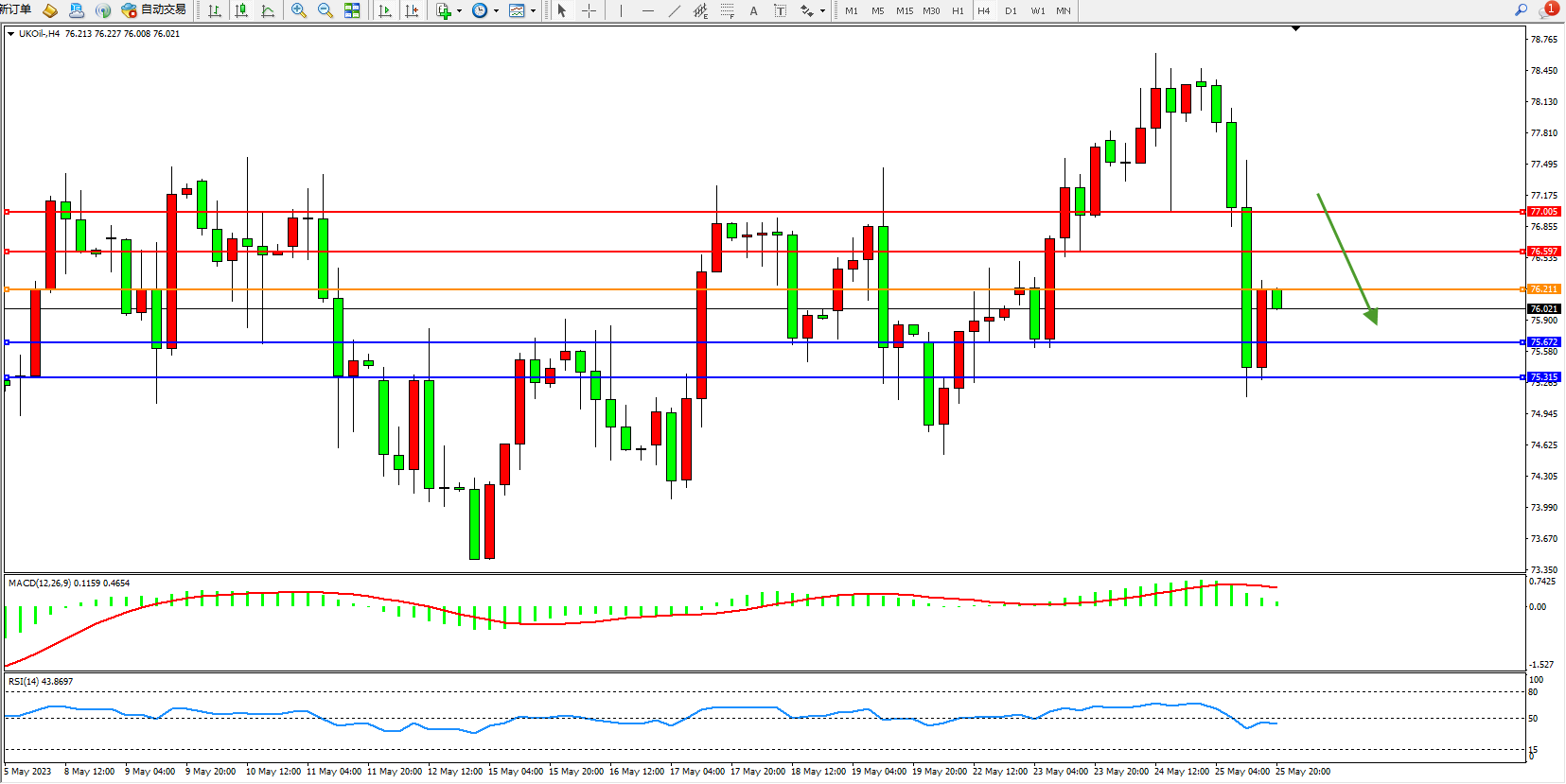 布油维持76.211附近震荡,美国债务上限谈判的不确定性让风险情绪趋于谨慎,原油投资者持观望态度,再加上美元进一步走强,这使得油价暂停涨势,需要等待进一步的催化剂。
