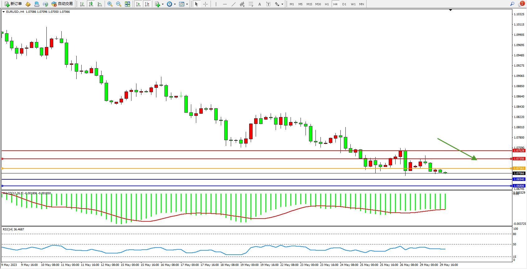 4小时图看:市场空头动力维持低位弱势下移,短期跌势未见止步,市场空头情绪依旧,短期有继续向下移动态势,MACD指标处于空头区域维持整理,RSI指标处于50均衡线下侧弱势整理;