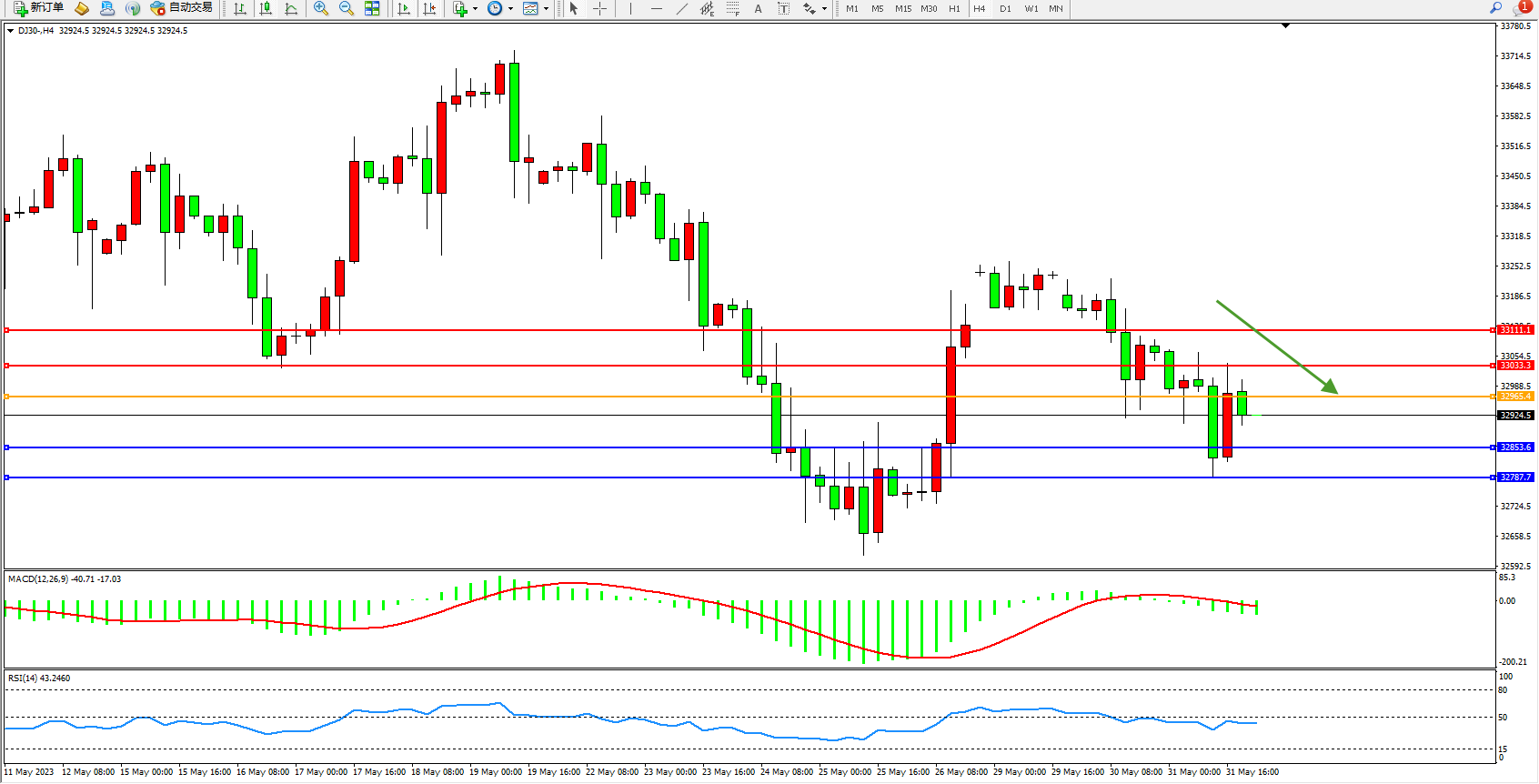 道琼斯指数5月31日(周三)收盘下跌131.88点,跌幅0.40%,报32910.90点;市场预计美联储维持利率高位运行的时间比此前预期的更长。若5月份劳动力市场和消费者价格数据继续出人意料地偏强,美联储将毫无疑问地在6月再次加息。