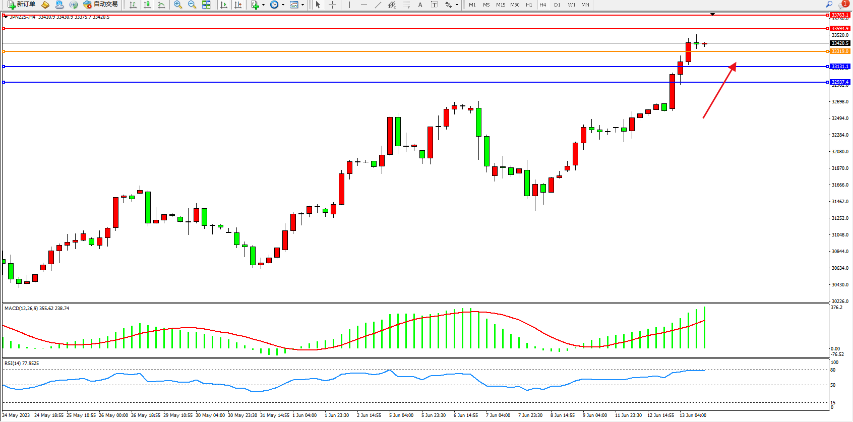 4小时图看:高位多头动力持续震荡拉升,短期看涨情绪依旧,市场多头不断向上移动中,MACD指标处于多头区域高位上移,RSI指标处于超买区80均衡线附近徘徊;