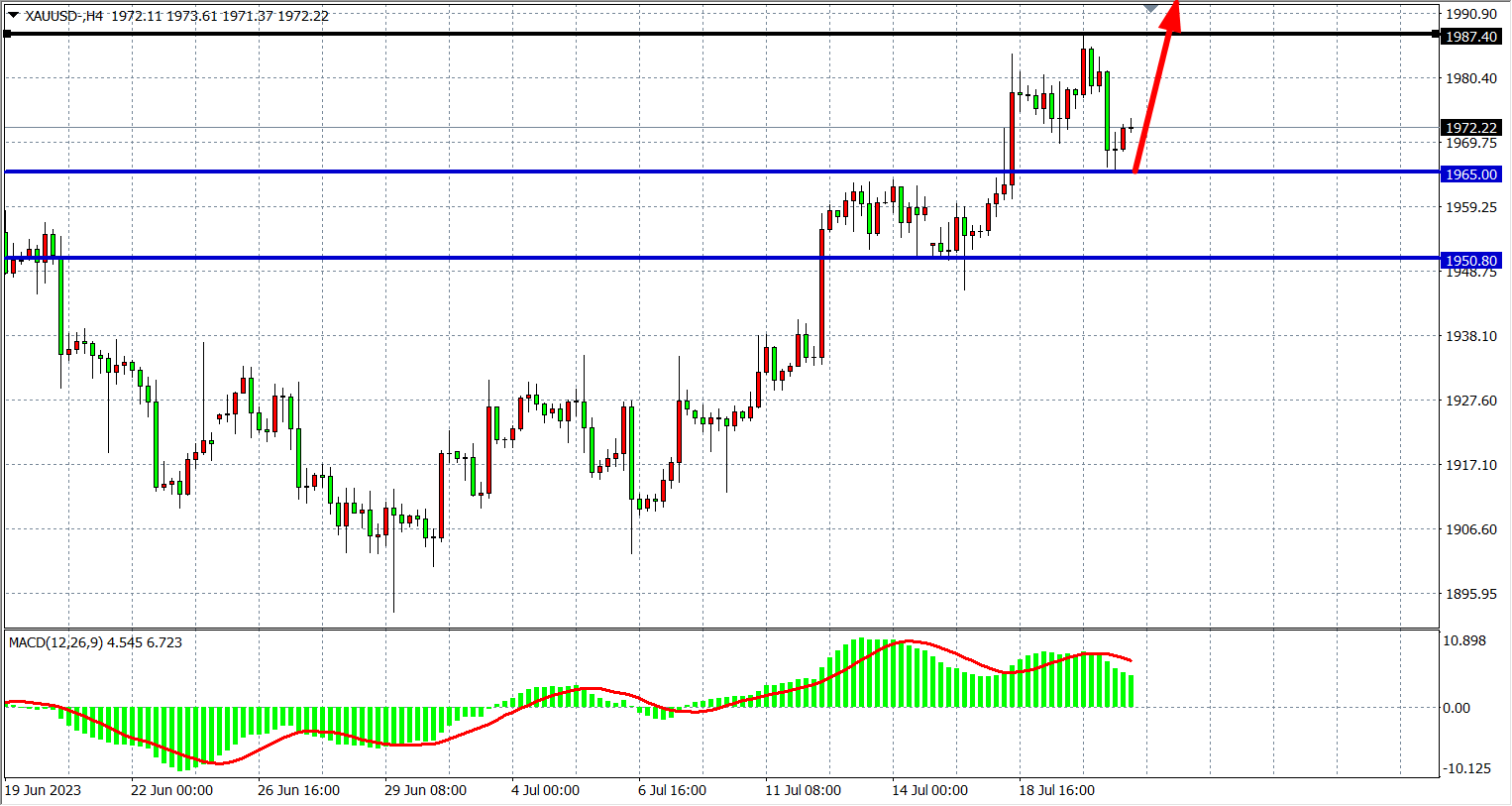 4小时图看,黄金在1987受阻回落,跌至1965附近,MACD量能维持在零轴上缩量,支撑关注1965-1950附近,上方阻力1987-2000。