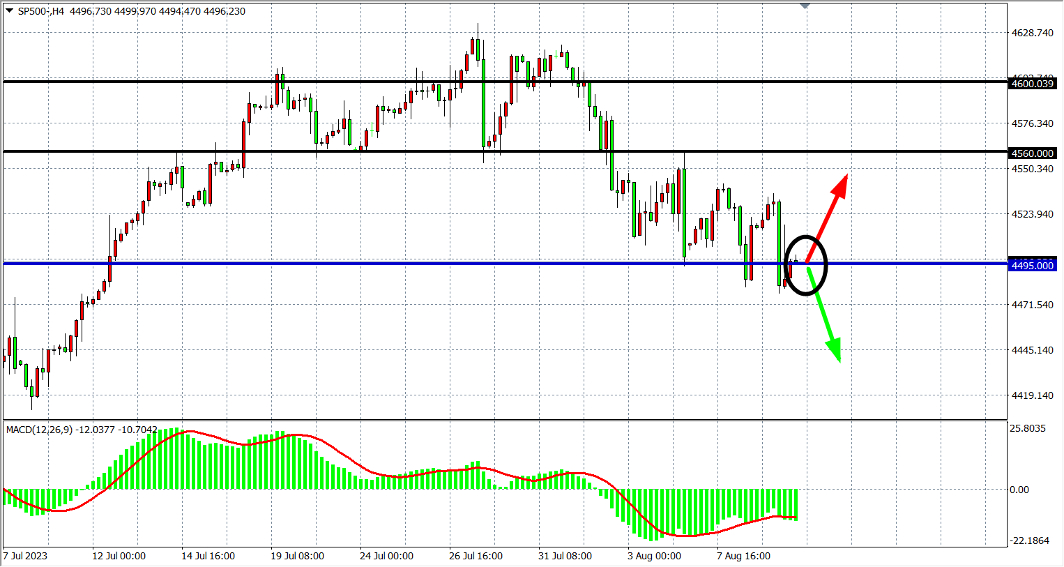 4小时图看,标普围绕4495附近震荡,MACD量能在零轴下缩量,行情走势仍较疲弱,支撑关注4495附近,阻力关注4560附近。