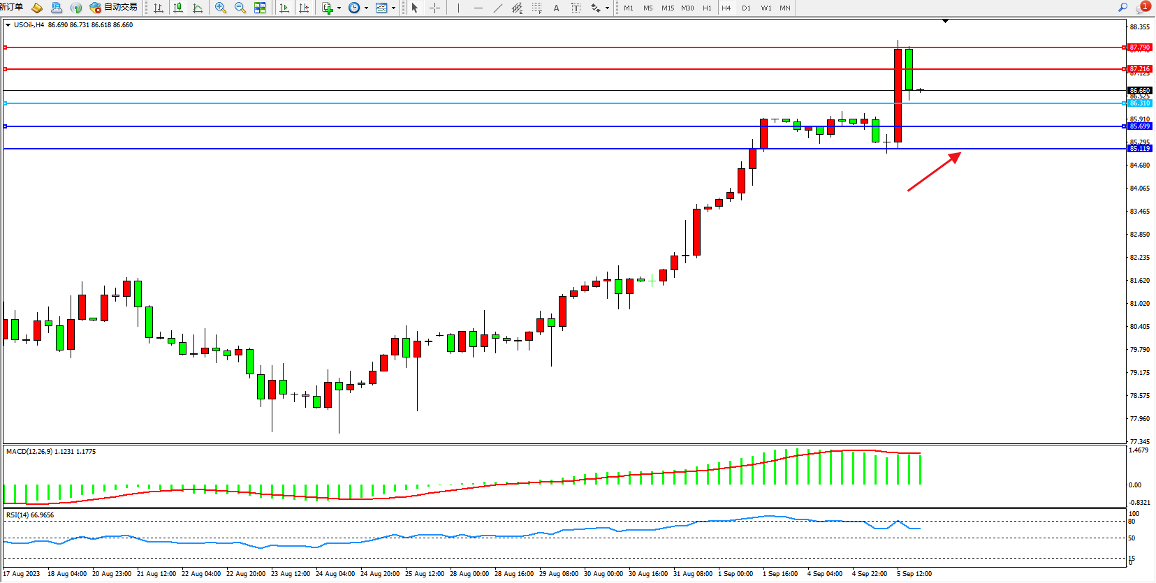 原油USOil——4小时K线图显示: