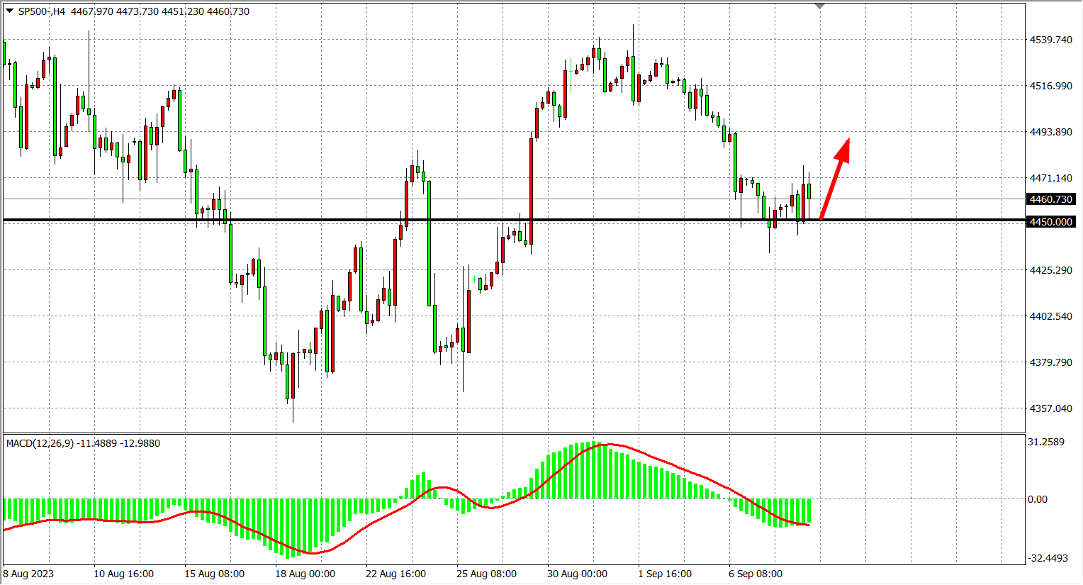 4小时图看,标普再4450附近徘徊,MACD量能在零轴下有所缩量,行情进入盘整,支撑关注4450附近,阻力看4480-4510附近。