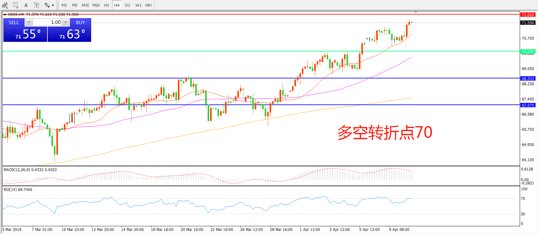 4小时图看,油价突破70美金后阳线连续拉升,短期走势依然偏强,均线系统呈多头排列,MACD红柱减少,RSI指标走平,日内延续上行概率较大。
