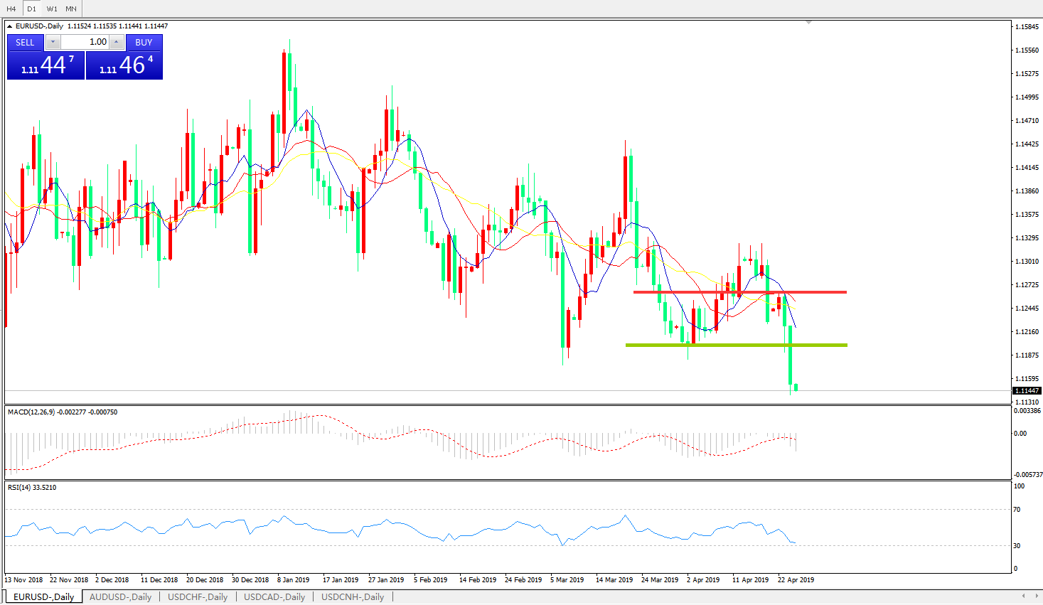 技术面简析:日图均线呈有序空头排列,汇价跌破前期低点快速下行,MACD0轴下方运行且动能柱快速放量,RSI快速走低,下行空间打开,预计汇价将进一步走低。