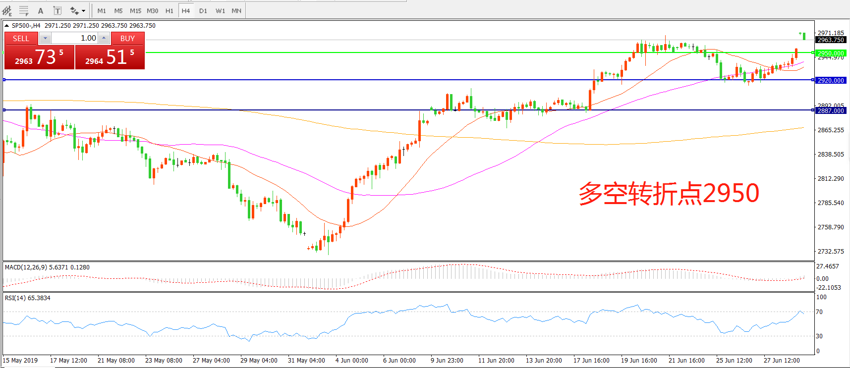 周五6月29日,标普500以小幅收涨结束了今年上半年最后一个交易日。整个6月,标普500涨幅超过6%,而在周末大阪G20会议的中美元首会晤中,美方表示不再对中国出口产品加征新的关税,两国经贸团队将就具体问题进行讨论。中美贸易摩擦的缓和有利于缓解市场担忧情绪,利好股市。标普500今日跳空高开,截止发稿前收报2966.98点。