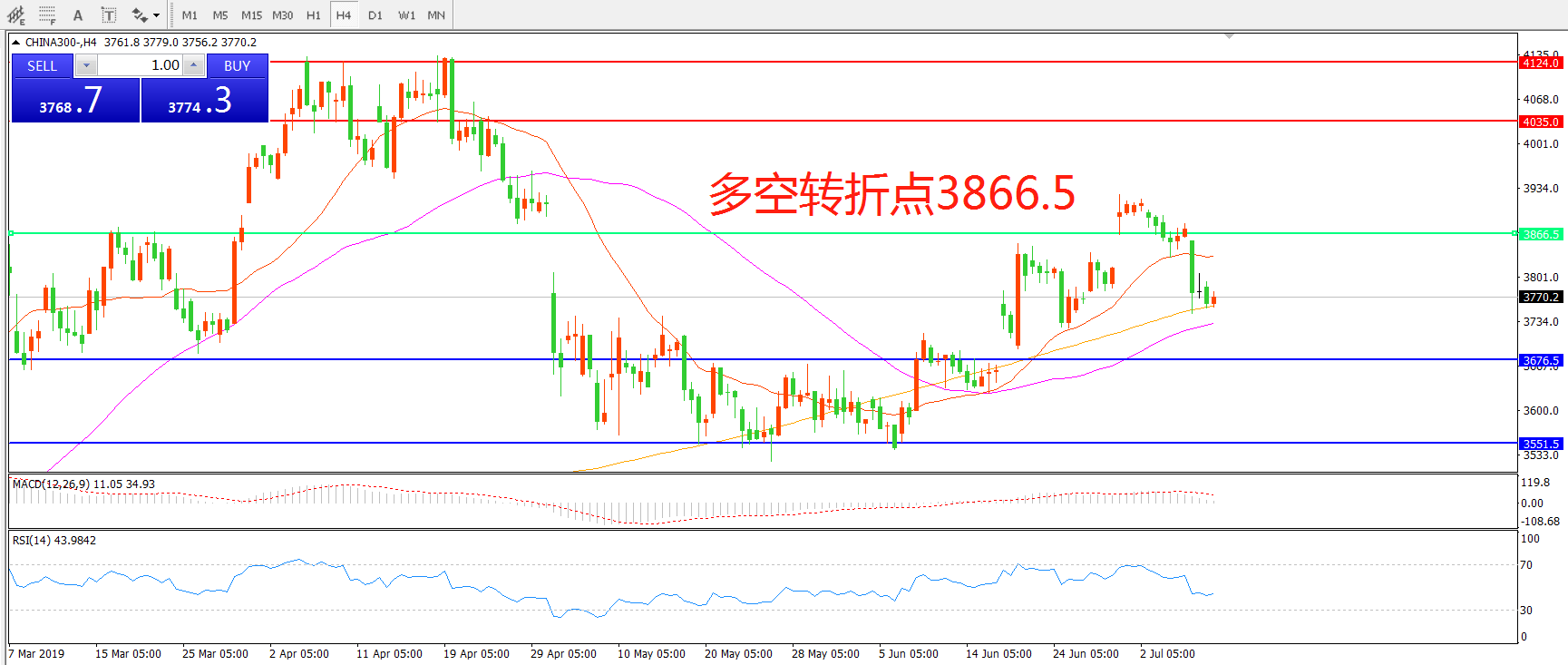 4小时图看,沪深300指数近期长阴下破后无力反弹,整体走势偏弱,但长期均线系统依然成为下方支撑,MACD红柱缩短,RSI指标走平,日内延续震荡概率较大。