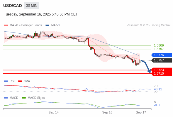 美元/加元 当日内 : 看跌,在 1.3776 之下。