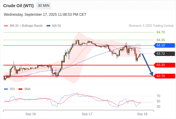 美国原油 (WTI) 期货 (X5) 当日内: 短期关键阻力位在64.10。