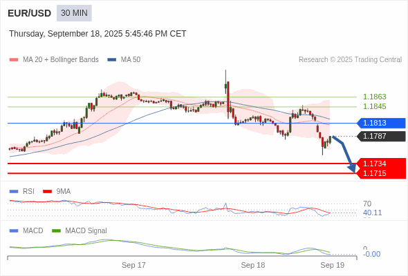 欧元/美元 当日内 : 看跌,在 1.1813 之下。