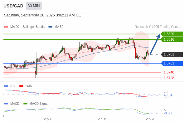 美元/加元 当日内 : 有上涨的可能,目标价位定在 1.3829 。