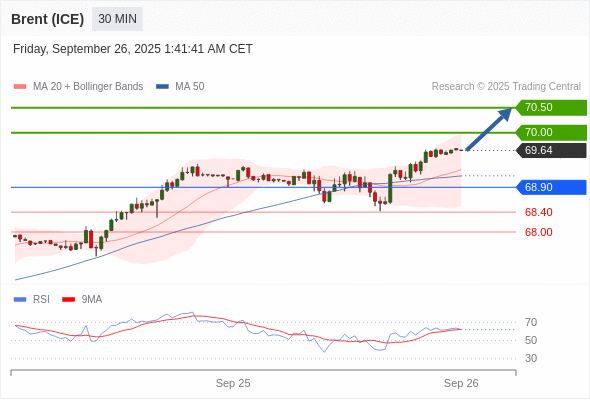 在 68.90 之上,看涨,目标价位为 70.00 ,然后为 70.50 。