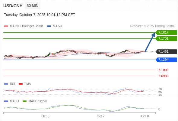 备选策略: 如跌破 7.1294 ,USD/CNH 目标方向定在 7.1099 和 7.0983 。