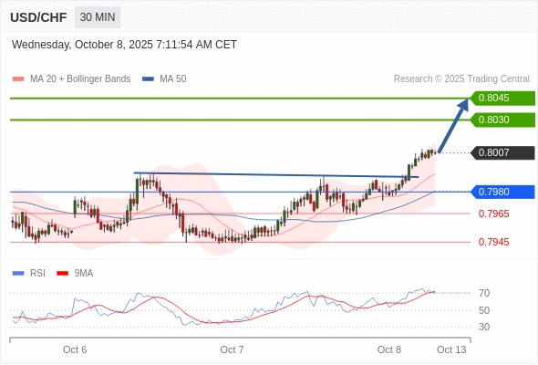 在 0.7980 之上,看涨,目标价位为 0.8030 ,然后为 0.8045 。
