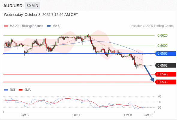 在 0.6585 之下,看跌,目标价位为 0.6545 ,然后为 0.6530 。